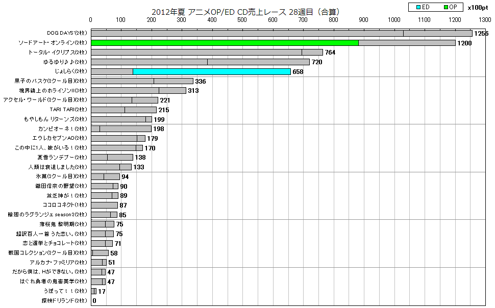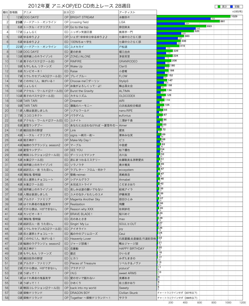 『ソードアート・オンライン』がOP/ED合算で12万枚突破。『DOG DAYS'』に約5600枚に接近。23週連続ランクイン中で、EDの脱落により登場数も単独首位となったOPも今週の売上は500枚未満。あと12週は・・・流石に無茶ですねぇ。