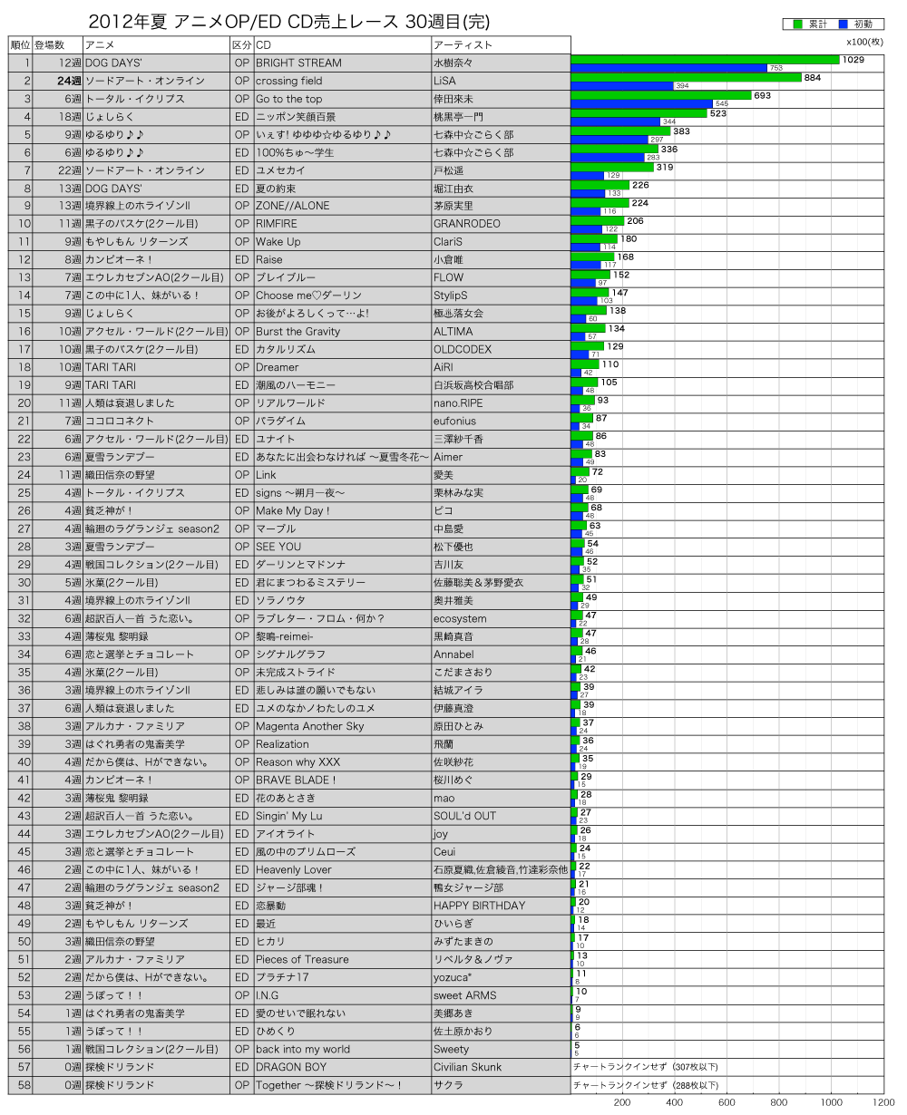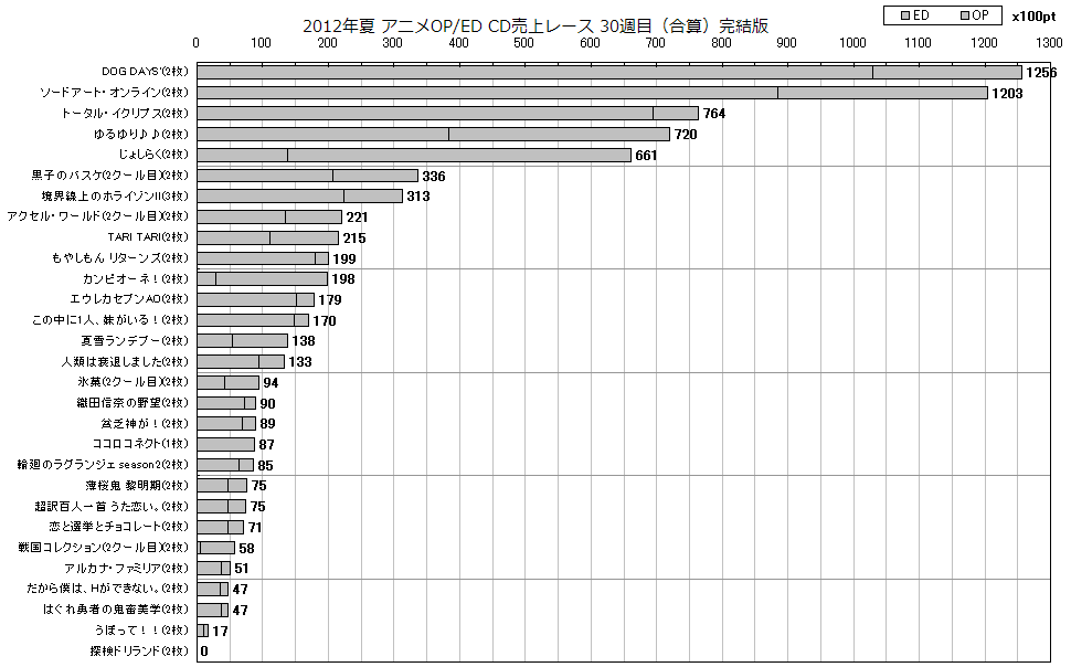 2012年夏アニメOP/ED合算 CD売上レース30週目(完結編)