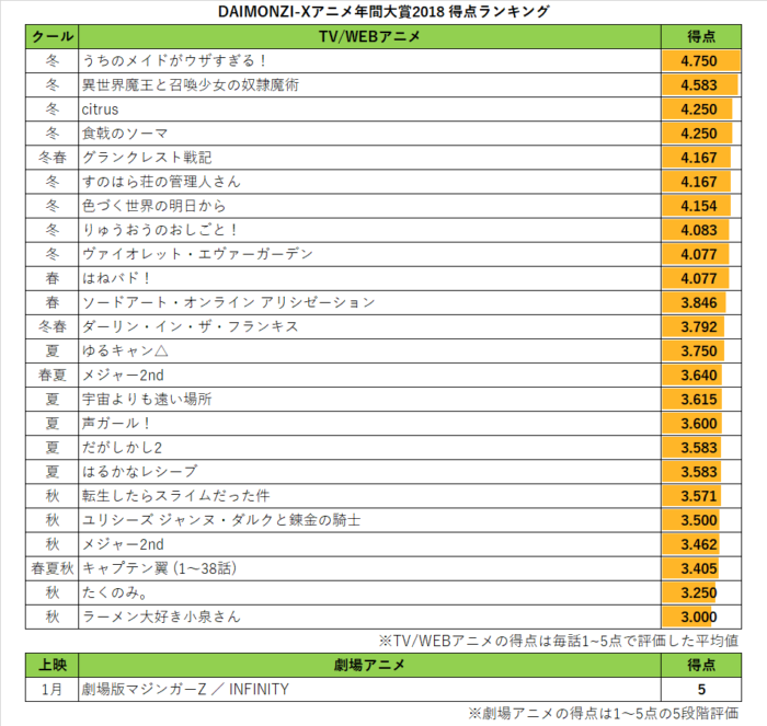 みなさんこんにちは、アニメ大好き大鋼 断です。当ブログではクール毎にアニメ感想記事を書いていますが、この記事は1年間4クールの中でベストなアニメを決めて勝手に表彰してしまおうという企画です。名付けて、DAIMONZI-Xアニメ年間大賞・・・!