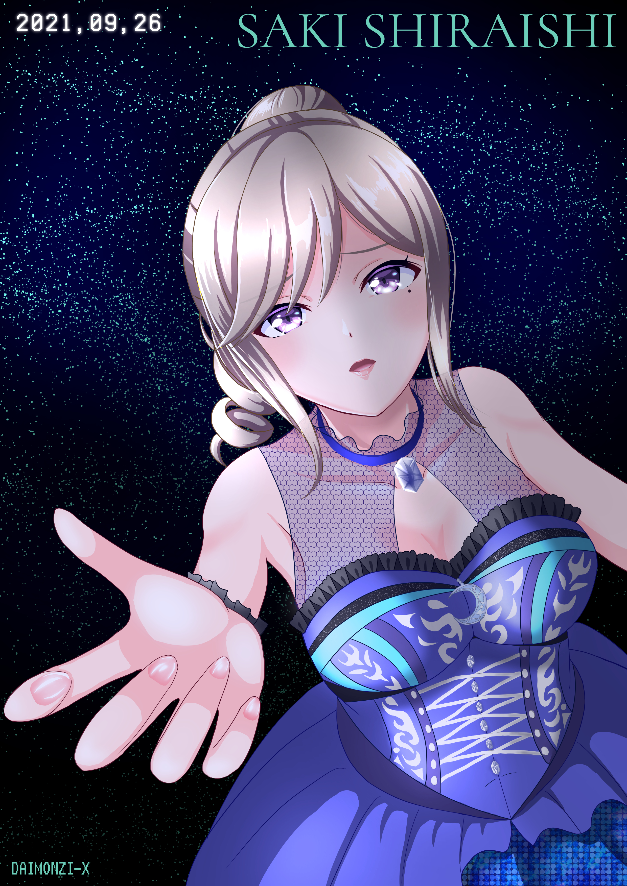 2021年の沙季バースデーイラスト。この絵は、沙季は本当によく描けたと今でも思っていて、表情もそうだし、肩の三角筋もしっかり描いているし、アイプラの3Dのこだわりポイントでもある爪を全面に押し出しているのも良い。ただ、背景の星空・・・前回の芽衣は七夕ってことで天の川だ!って言えたんですけど、今回は流石に星多過ぎな上に沙季のイメージカラーにしているので、よくわかんないことに。移動ぼかしとかうまいこと使ってペンライトっぽく見せることもできたのかなぁ・・・と考えてしまうのは、シチュエーションからブレてる証拠でしょうか。