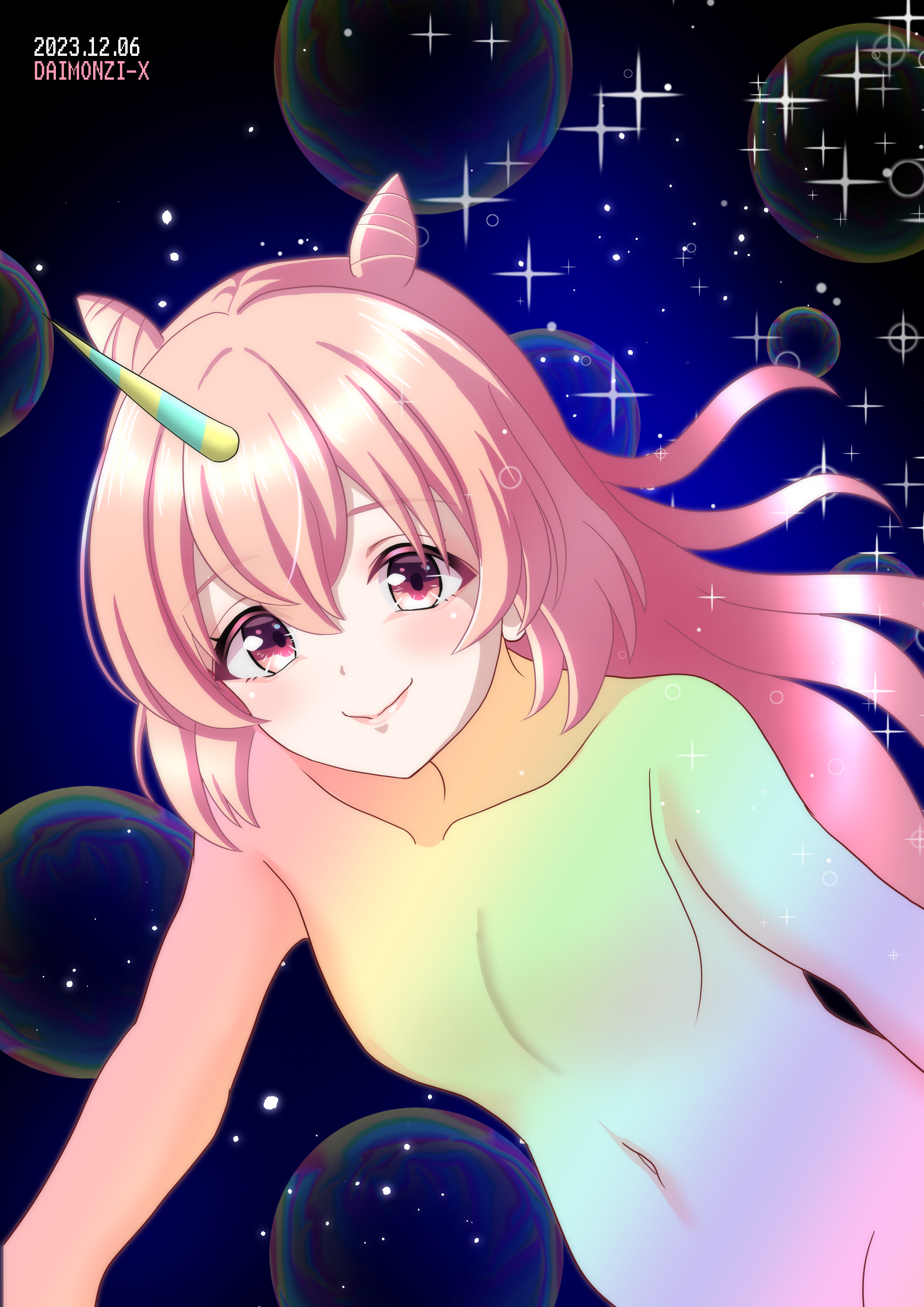 最初はちゃんと衣装を描こうと思っていたのですが、とても間に合わないなーと思って、何か服を描かなくていい方法は・・・と考えた結果の虹色ボディです。元々は魔法少女の変身的な感じになればなーと思っていたのですが、一旦出来上がった絵を見て、流石に謎な絵だな・・・と思って、これまた色々考えた挙げ句、後付けでツノをつけてユニコーン設定にしました。こころのトレーニングウェアのアレです。