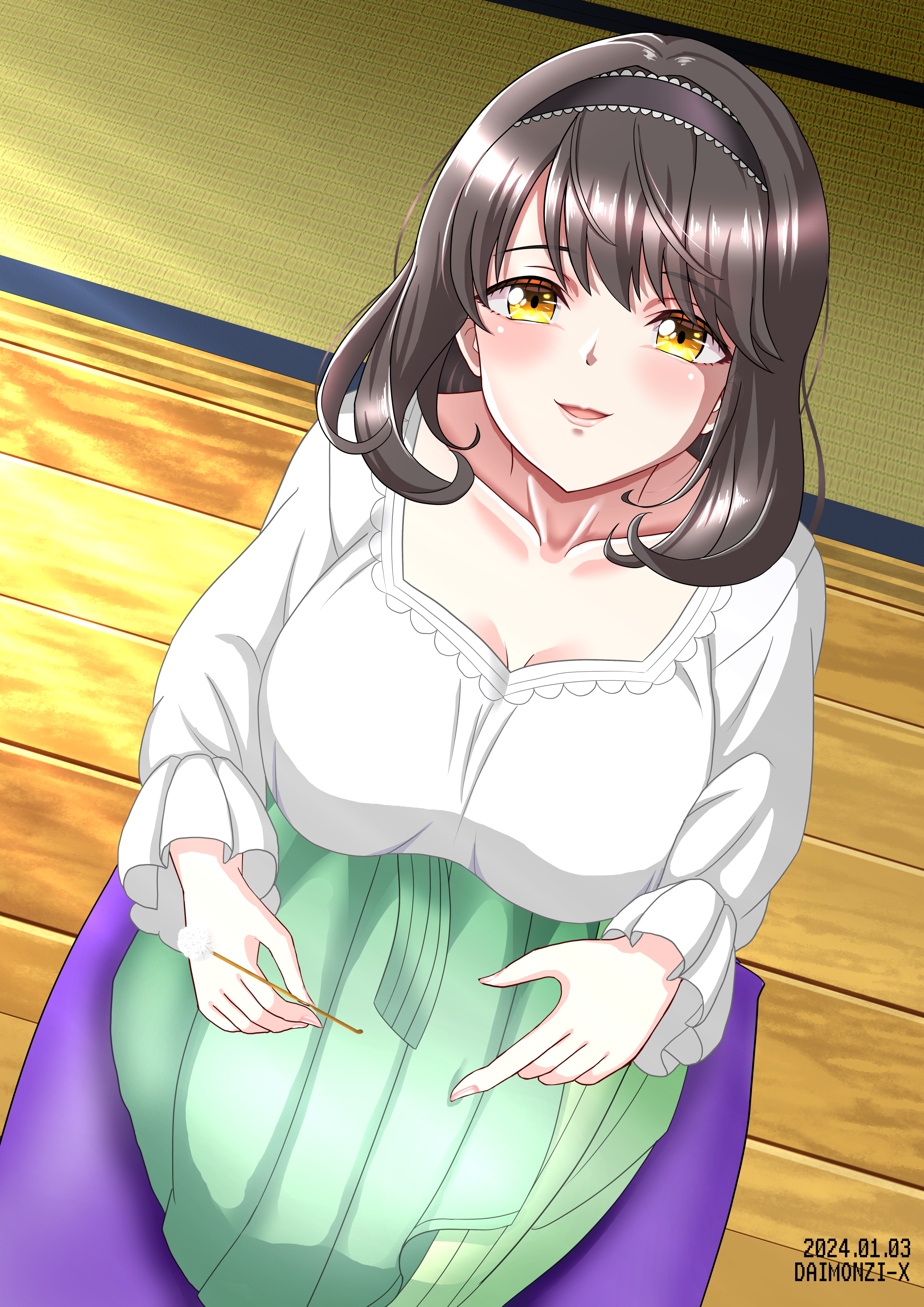 背景は、フローリングは2D素材、畳は3D素材です。日当たりの良い縁側にするために、うっすらとスポットライト(昨年の怜誕生絵のカーテンでも使った超便利な素材)を当てたのですが、結果的にはフローリングがいい感じに色褪せてくれました(日が当たってない遙子の右側は質感がちょっと味気ないよね・・・)。