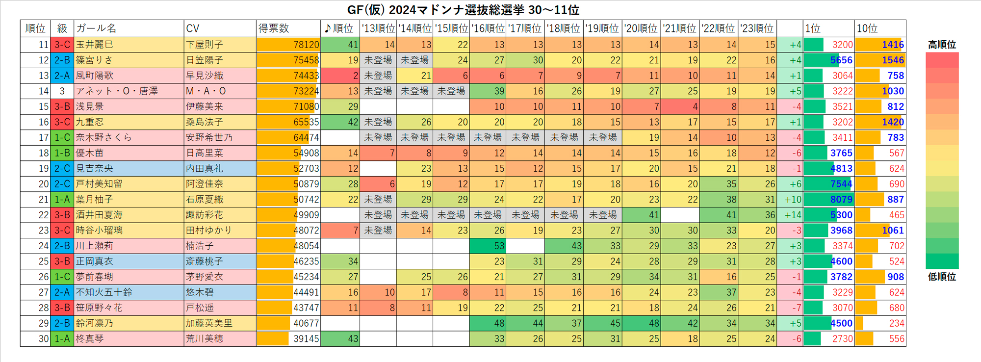 この順位帯からは票数が公表されています。上位にいくほど順位の変動が少ないのも特徴で、例年、順位不動のガールが多い傾向があります。一方でTOP21~30は順位の変動は大きく、かつて不人気だったガールでも頑張れば到達できる位置と言えます。