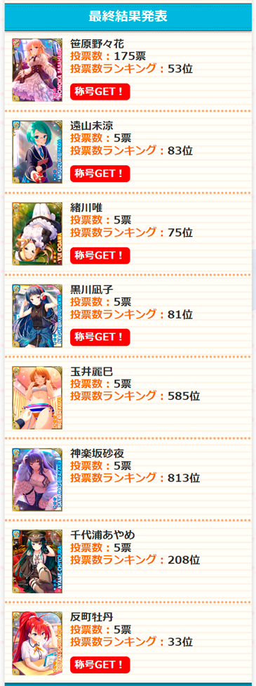 笹原野々花先輩は7ランクDOWNで28位。この順位帯で最も順位を落としたガールに。自己記録でもこれまでのワースト記録を更新してしまいました。僕は今年は175票投じましたが、この票数で称号獲得できてしまったのがちょっと複雑です。