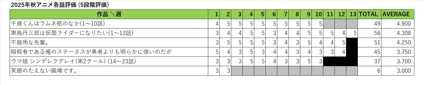 今回、途中で放送延期があって、結局11~13話が春に配信される形となってしまいました。なのでこの4.90という数字はまだ下がるかもしれないし上がるかもしれません。2025年の年間大賞では参考記録として、2026年春に最終的な数字を出したいと思います。